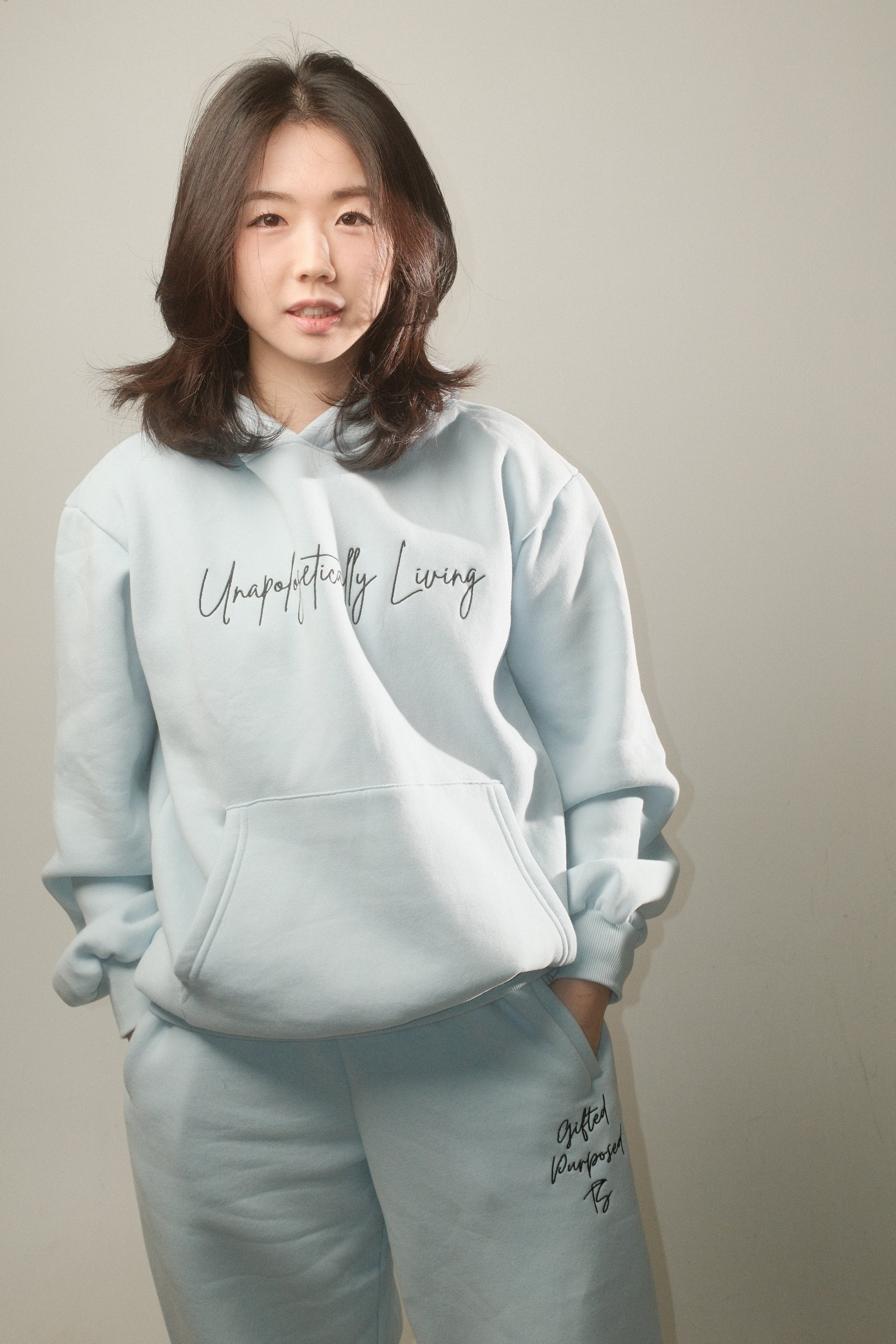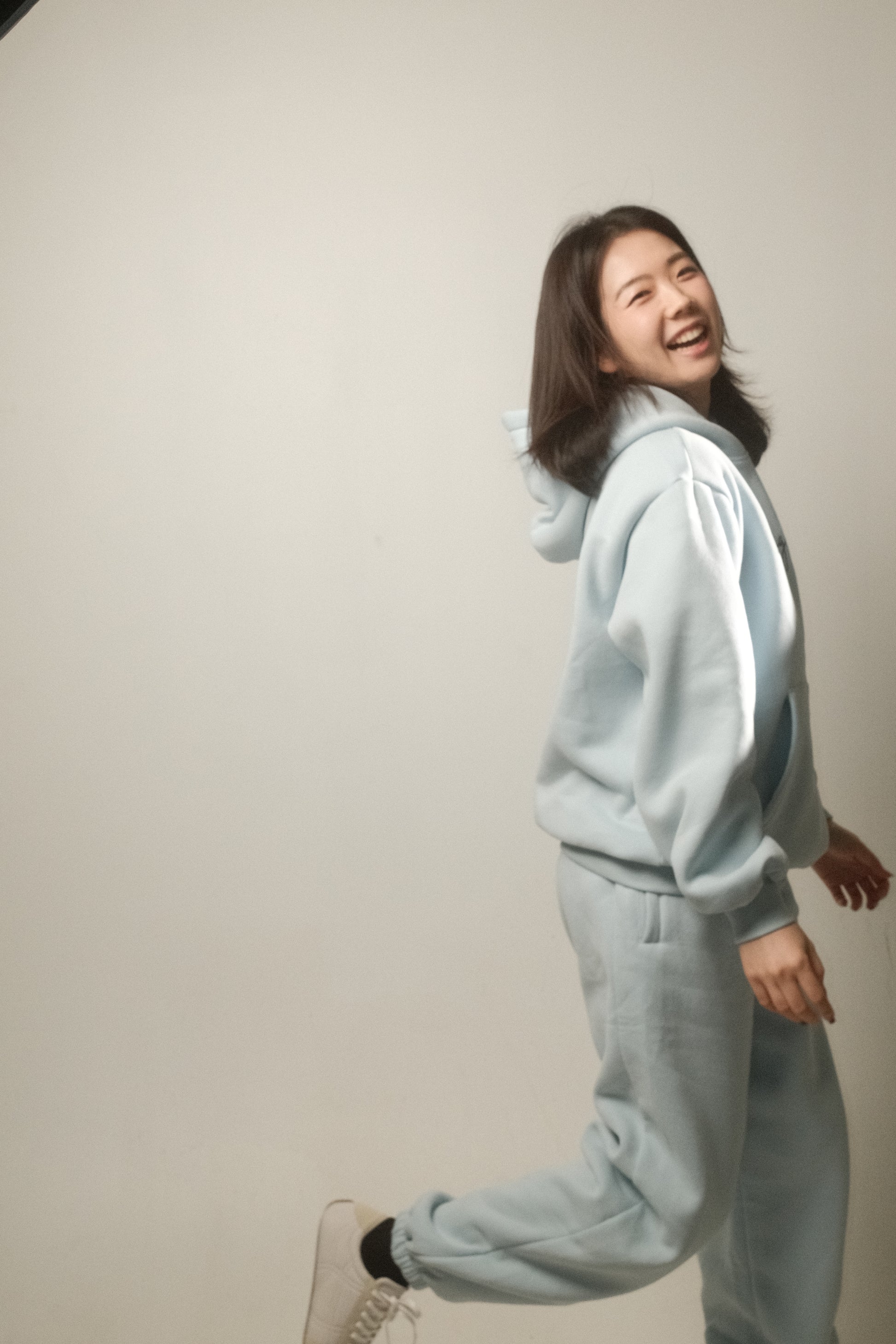 Comfy, cloud feeling, powdered blue sweat pants with embroidery " gifted, purposed" and brand logo "TS"
