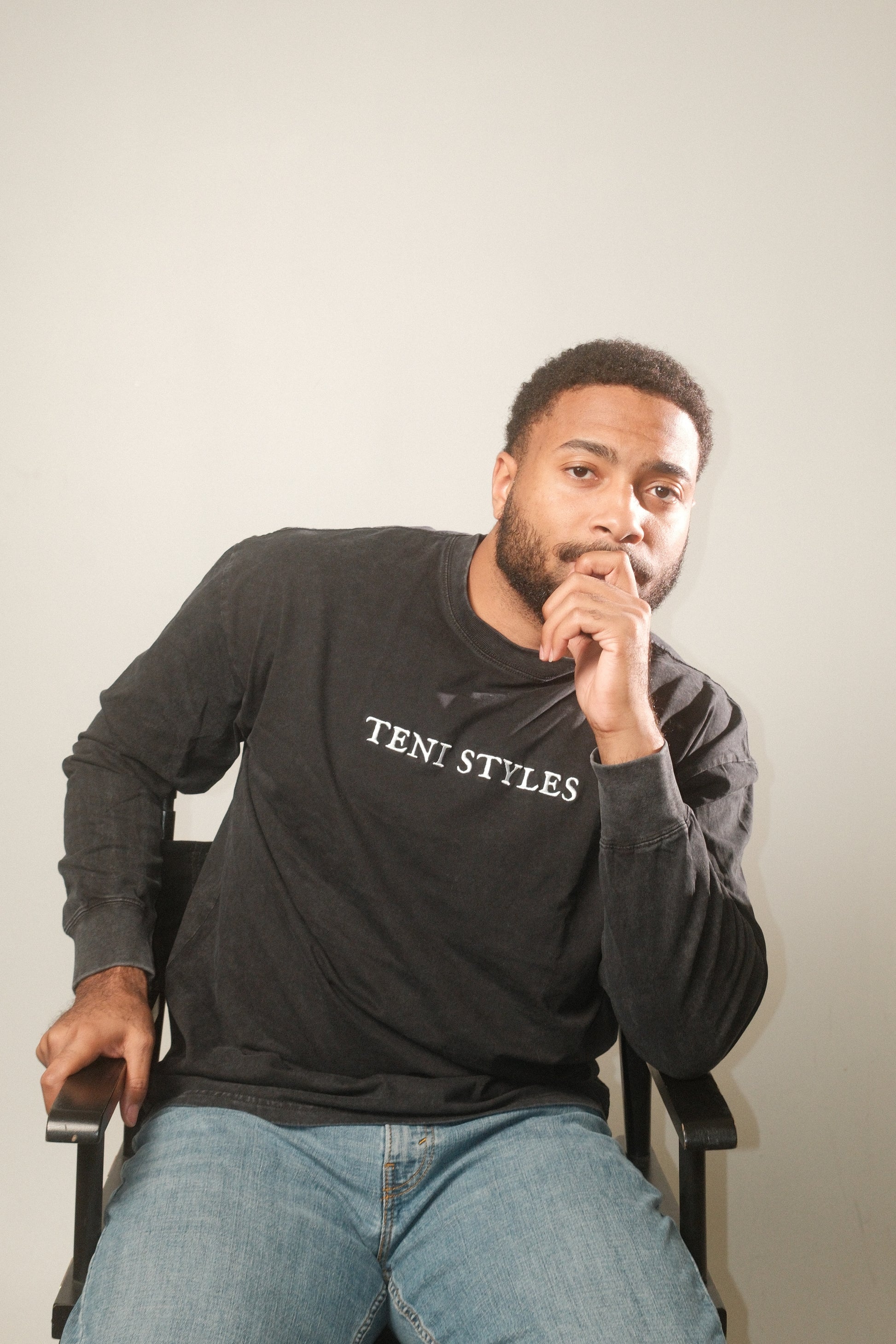 Ash black, loose fitted, long sleeve round neck shirt with Teni Styles logo branded at the front.